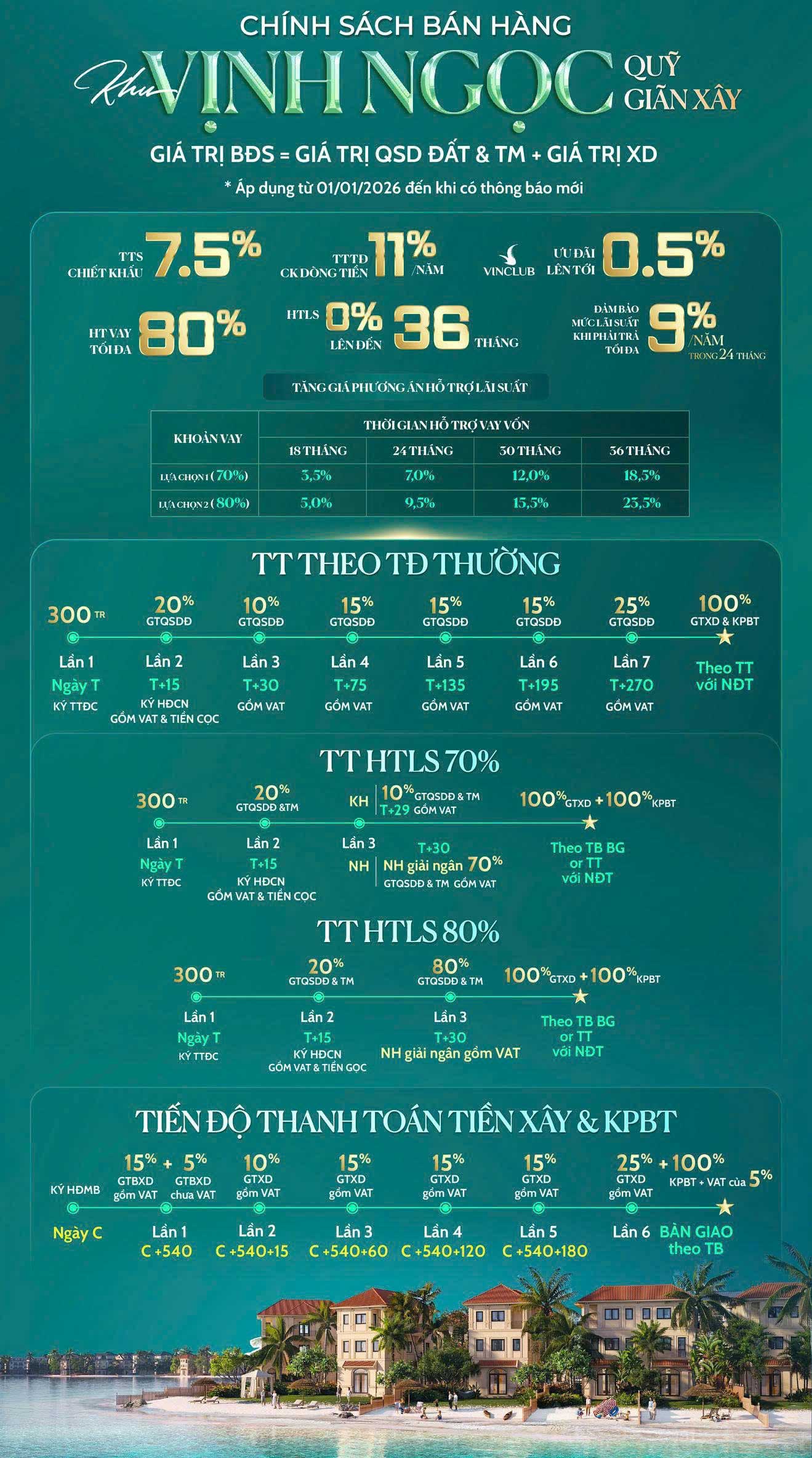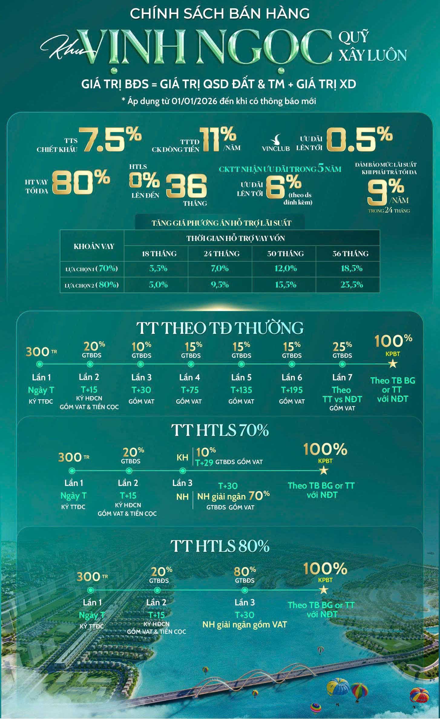 Phương án thanh toán vay HTLS: Bổ sung chính sách đảm bảo lãi suất tối đa 9%/năm trong vòng 24 tháng sau khi kết thúc thời gian HTLS cho các căn ký Tài liệu giao dịch đầu tiên từ 01/01/2026 – 31/01/2026.