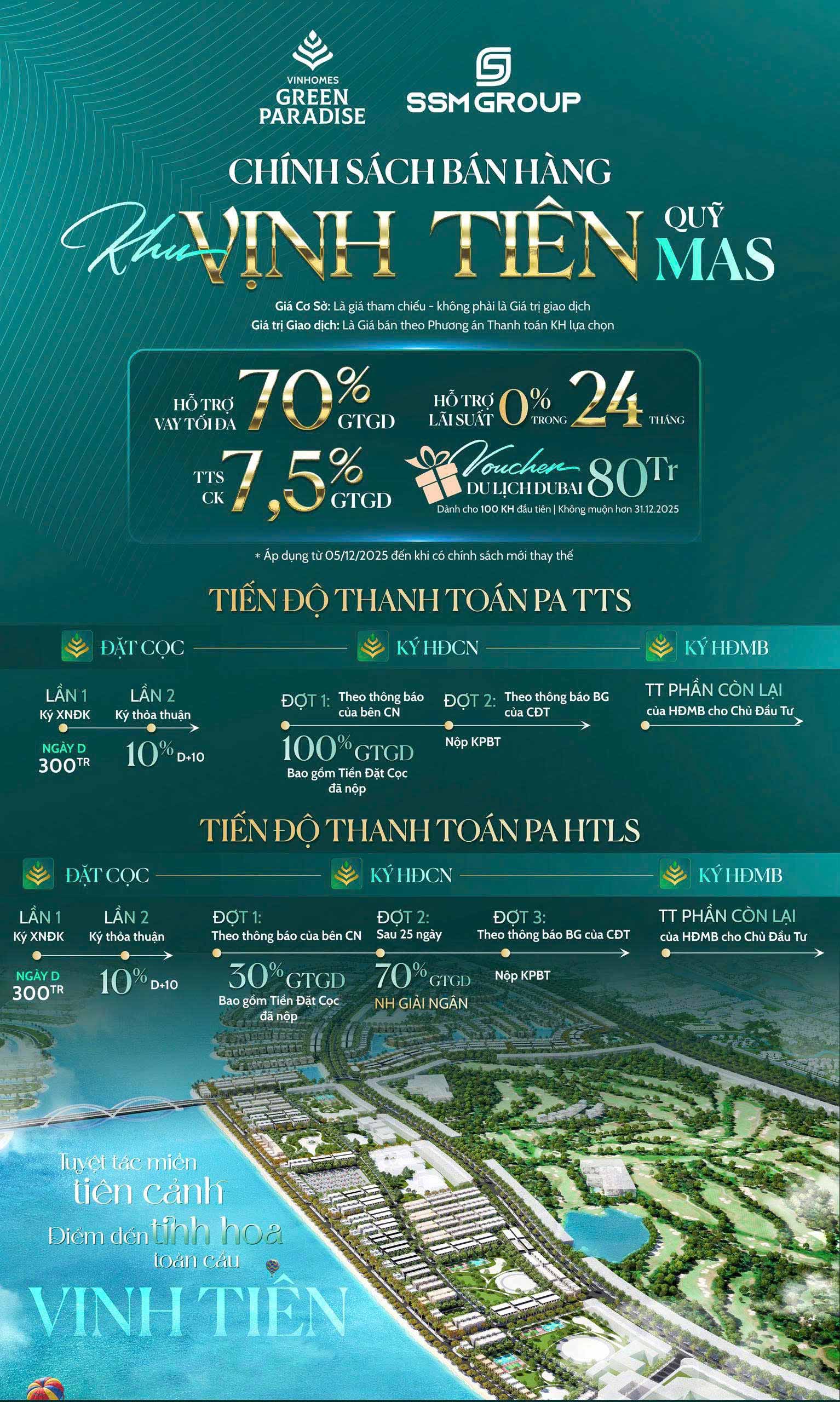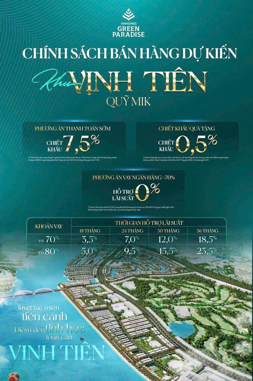 Chính sách bán bán hàng của dư án Vinhomes Green Paradise Cần Giờ tại Phân Khu Vịnh Tiên được chủ đầu tư công bố ngày 2026-01-01. Các quỹ hàng Mik và Mas sẽ có chính sách khác nhau.