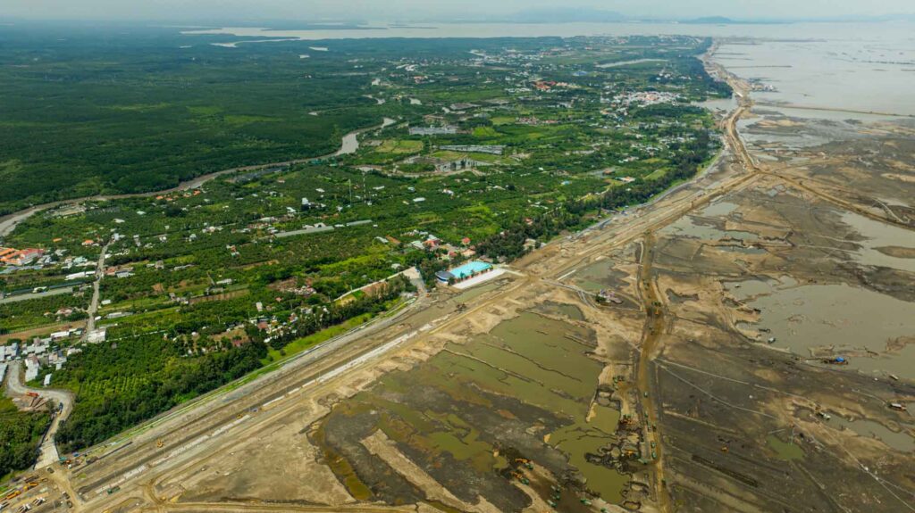 Giữ vai trò trục đối ngoại huyết mạch, xương sống kết nối các phân khu của siêu đô thị lấn biển lớn nhất Việt Nam, đại lộ này dài tới hơn 8 km. Con đường kéo dài hết đường bờ biển hiện tại, từ thị trấn Cần Thạnh qua xã Long Hoà cũ. Và trong tương lai, nó sẽ nối phân khu A – trung tâm du lịch, giải trí quy mô lớn ở phía Tây đến phân khu B – khu thương mại, thể thao, dịch vụ ở phía Đông dự án. Ảnh: Lý Ngọc Hoa.