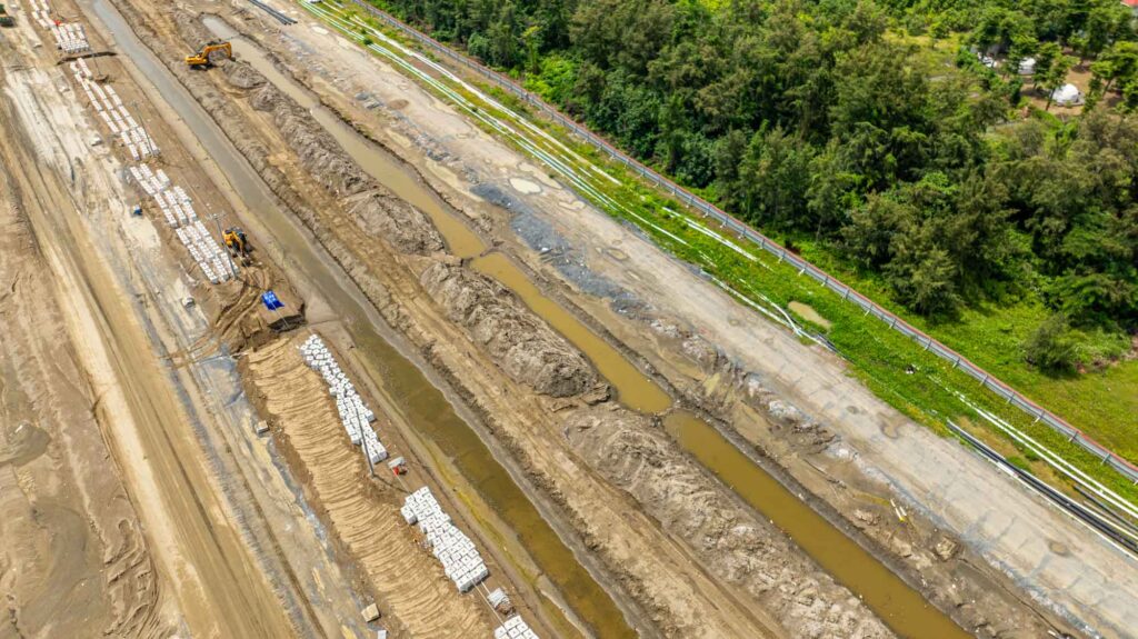 Ở hướng phân khu A (Vịnh Tiên – The Haven Bay), bước đầu định hình rõ mặt cắt đại lộ với dải phân cách trung tâm và hệ thống thoát nước hai bên.